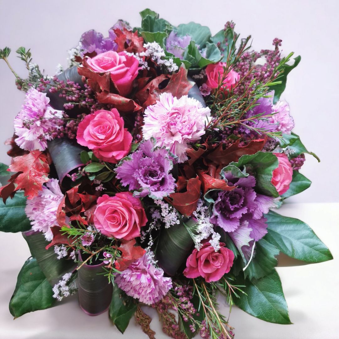 Bukiet zawiera starannie dobrane kwiaty, takie jak: goździki, róże, gerbery, margaretki, eustomy, kwiaty sezonowe, które nadają mu wyjątkowy charakter i piękno. Każdy kwiat został dobrany pod kątem kolorystyki oraz struktury, aby bukiet był harmonijny i przyciągał wzrok.