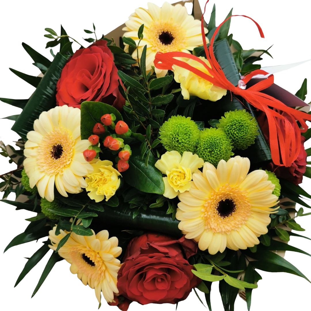 Bukiet zawiera starannie dobrane kwiaty, takie jak: goździki, róże, gerbery, margaretki, eustomy, kwiaty sezonowe, które nadają mu wyjątkowy charakter i piękno. Każdy kwiat został dobrany pod kątem kolorystyki oraz struktury, aby bukiet był harmonijny i przyciągał wzrok.