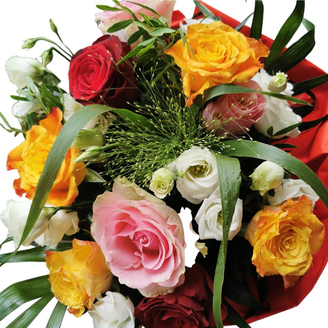 Bukiet zawiera starannie dobrane kwiaty, takie jak: goździki, róże, gerbery, margaretki, eustomy, kwiaty sezonowe, które nadają mu wyjątkowy charakter i piękno. Każdy kwiat został dobrany pod kątem kolorystyki oraz struktury, aby bukiet był harmonijny i przyciągał wzrok.