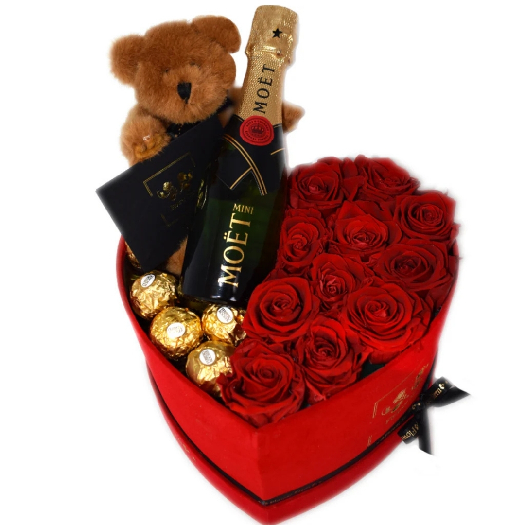 Czerwone pudełko w kształcie serca, czerwone róże, czekoladki Ferrero Rocher, mały pluszowy miś, mini szampan MOET