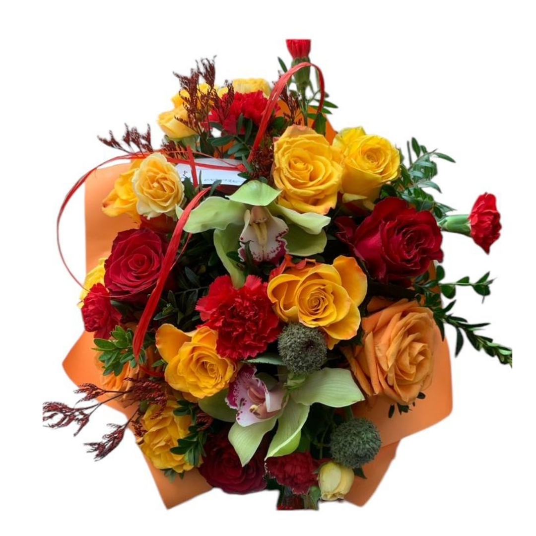 Bukiet zawiera starannie dobrane kwiaty, takie jak: róże, goździki, santoni, eustomy, kwiaty sezonowe, które nadają mu wyjątkowy charakter i piękno. Każdy kwiat został dobrany pod kątem kolorystyki oraz struktury, aby bukiet był harmonijny i przyciągał wzrok.