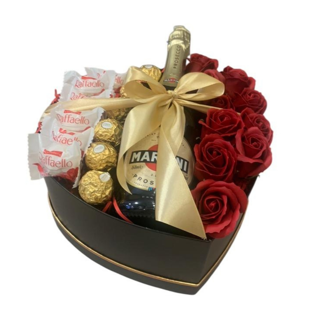 Czarne pudełko w kształcie serca, czerwone róże, mix czekoladek Rafaello i Ferrero Rocher, mini Martini